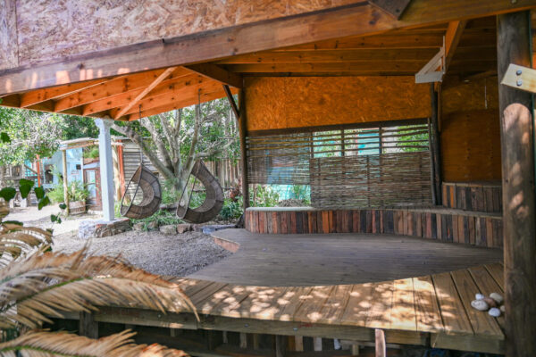 Our eco amphitheatre lends itself perfectly for talks, screenings, demos, wedding ceremonies and performance arts. The flowing organically shaped tiered-seating and decking is sheltered and seats 40 guests comfortably, with space for more with the additions of chairs or benches.